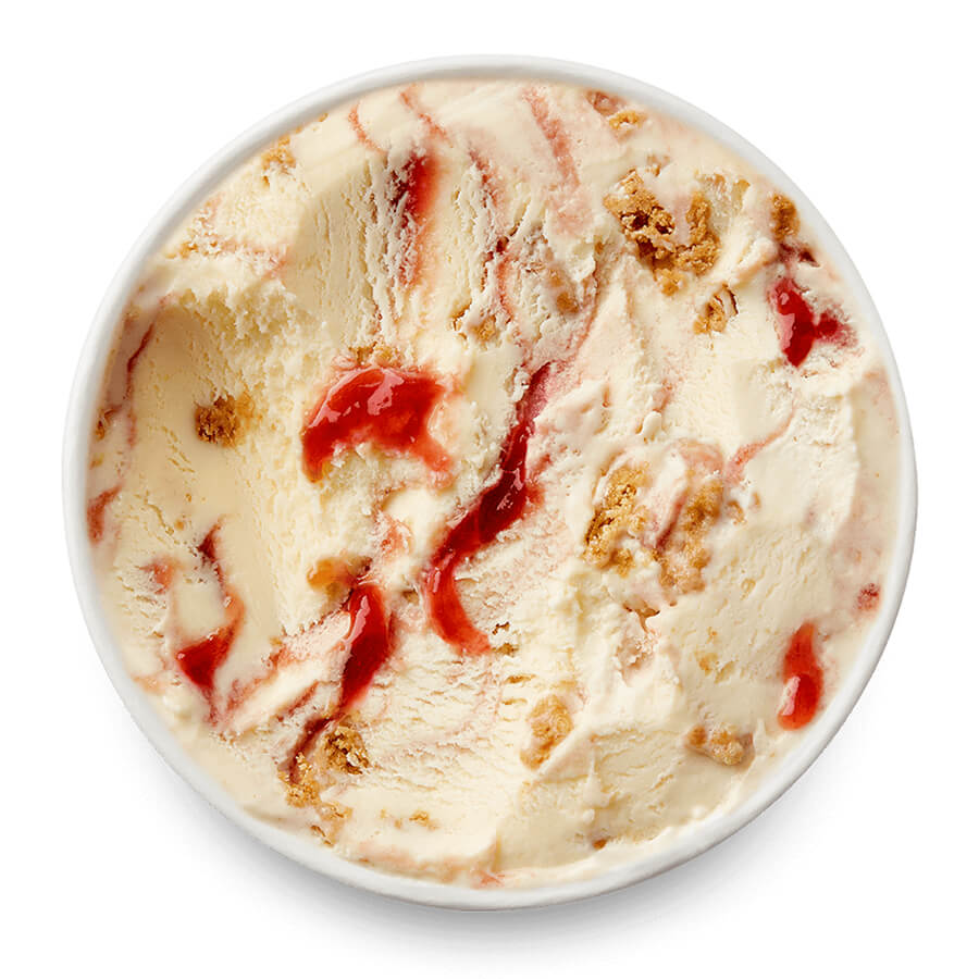 Το παγωτό cheesecake συναντά το τραγανό μπισκότο και το σιρόπι φράουλας δημιουργώντας μία πλούσια γεύση.