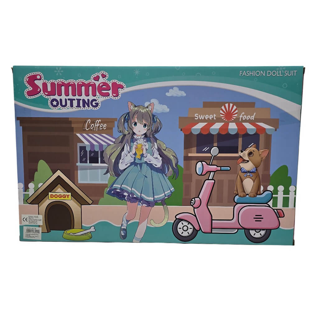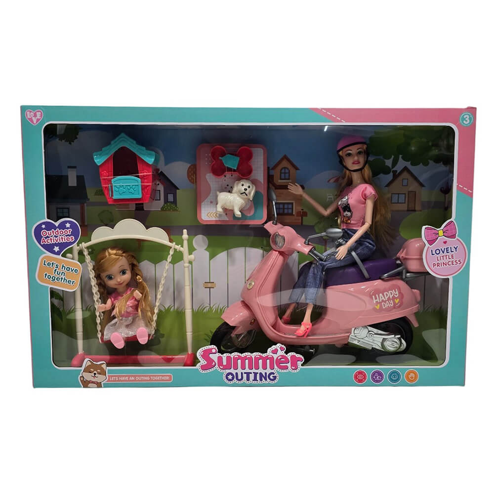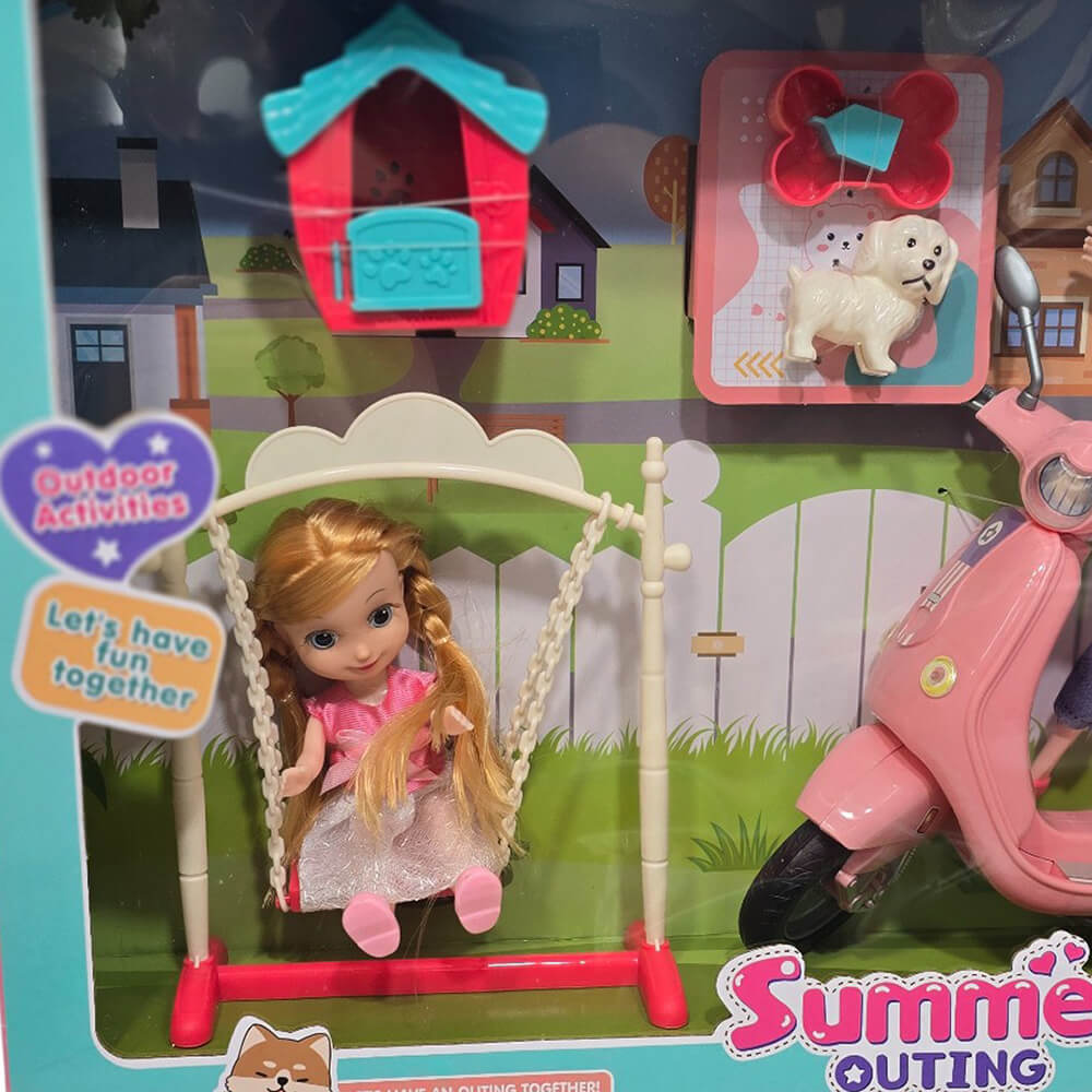 Η συσκευασία περιλαμβάνει μία κούκλα σε βέσπα, ένα κοριτσάκι σε κούνια και σκυλάκι.