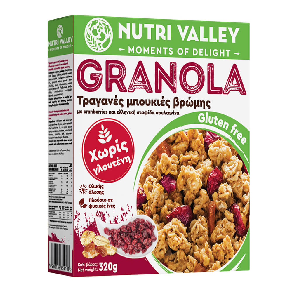 NUTRI VALLEY GRANOLA ΤΡΑΓΑΝΕΣ ΜΠΟΥΚΙΕΣ ΒΡΩΜΗΣ 320g ΜΕ GRANBERRIES & ΣΤΑΦΙΔΑ